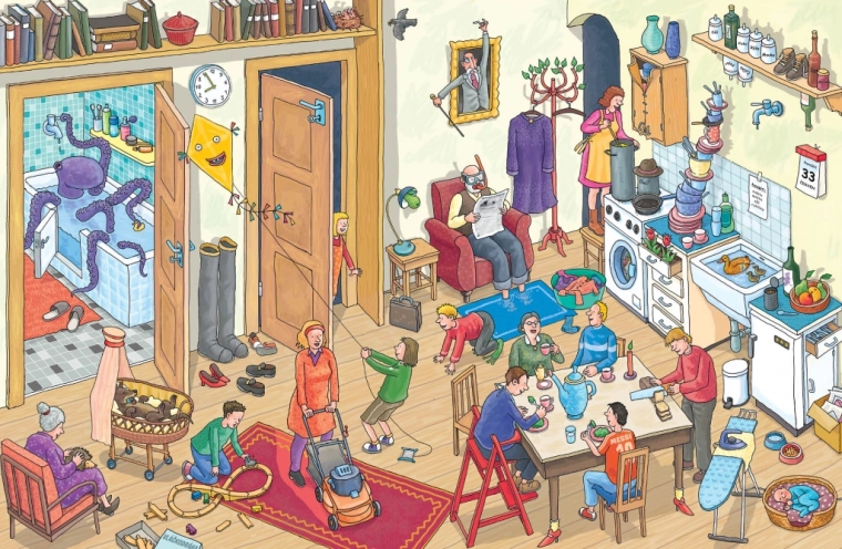 Fra en blæksprutte i badet til en plæneklipper på tæppet – hver scene vækker både latter og spørgsmål. Perfekt til træning af opmærksomhed og ordforråd.