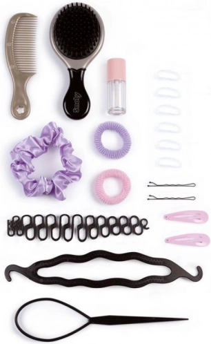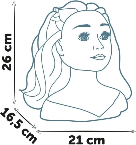 Friserhoved til at skabe trendy frisurer. Med en magisk funktion: brug den medfølgende læbepensel dyppet i koldt vand, og læberne bliver smukt farvede. Indeholder 19 stk. tilbehør, som du kan opbevare i et hemmeligt rum i soklens bund. Udstyret med sugekopper på undersiden af soklen for bedre stabilitet. Hovedets højde er 26 cm.