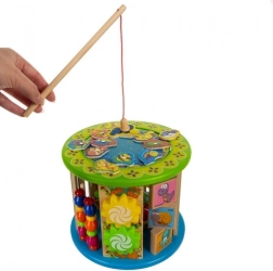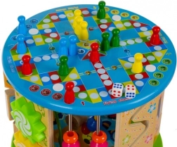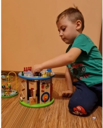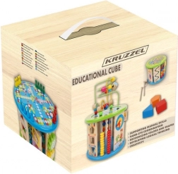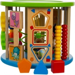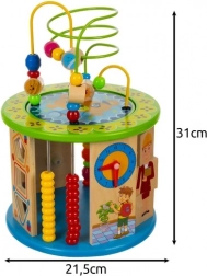 Denne kreative terning er designet til små opdagere og byder på 11 forskellige aktiviteter på alle sider inklusive toppen. Børn øver genkendelse af farver og former, lærer at tælle på kuglerammen, forstår princippet bag uret og forbedrer hånd-øje-koordination gennem labyrinten med perler og andre interaktive elementer.
