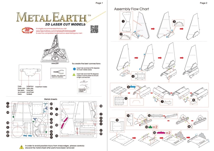 Fjern de enkelte dele fra metalpladerne; brug om nødvendigt små skævbider-tænger (medfølger ikke). Delene forbindes ved hjælp af låse bestående af en tap (næb) og et hul. Bøj tappen med små, slanke tænger (medfølger ikke), og saml gradvist alle låse, indtil der opstår et meget realistisk mesterværk!