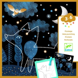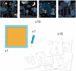 Pakken indeholder 16 baggrunde, 16 skabeloner, en perforeringsnål, en holder og en billedvejledning. Materialer af papir og pap med FSC-certifikat.