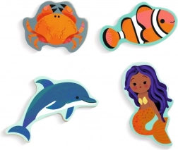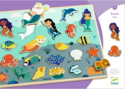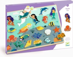 Det træbaserede indsætningspuslespil fra DJECO med havtema giver børn både sjov og læring i ét. Med solide træbrikker og en plade med farvede konturer lærer børn naturligt at genkende former og farver, samtidig med at de udvikler motoriske færdigheder.