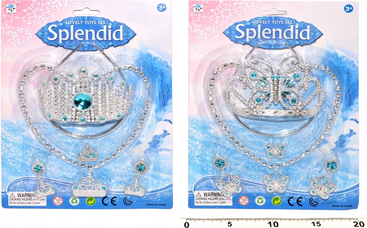 Fortryl den lille pyntedukke med et magisk prinsessesmykkesæt. Sættet indeholder krone, halskæde, ring og øreringe i pink eller lilla. Ideelt som tilbehør til fastelavns-/karnevalskostume eller til leg som prinsesse. Vælg mellem motiver af sommerfugle eller kroner.