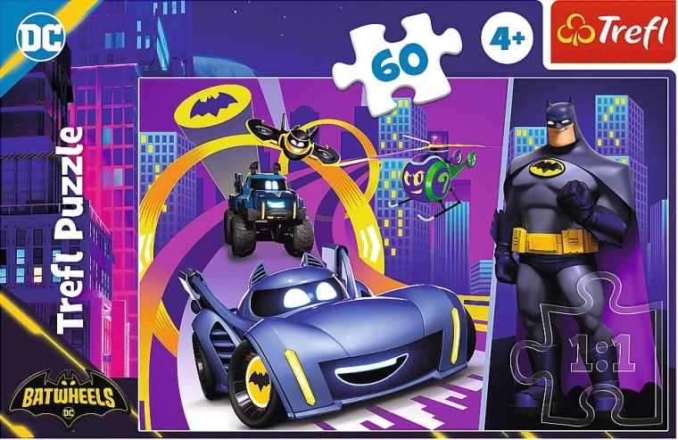 Batman og hans køretøjer er et puslespil med 60 brikker, ideelt til små fans af køretøjer fra DC-universet. Når det er samlet, danner det et billede på 330x220 mm.