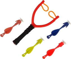 Slyngen er lavet af holdbare materialer godkendt til sikker brug og udstyret med et behageligt skumhåndtag. Sættet inkluderer fire farverige gummiprojektiler, som sikrer sikker leg takket være sugekopperne.