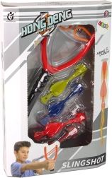 Pakken indeholder en rød slynge og fire farvede skud med sugekopper for sikker leg.