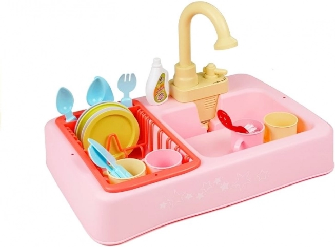 Vasken drives af 3 x 1,5V "AA"-batterier, som ikke medfølger. Når de er sat i legetøjet og knappen skubbes til "ON", suger hanen vand ind, og du kan begynde at lege opvask.