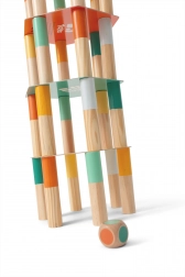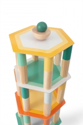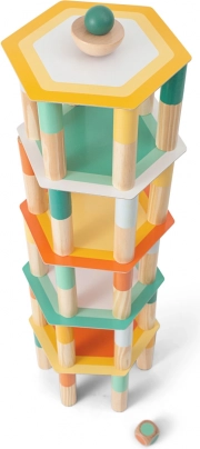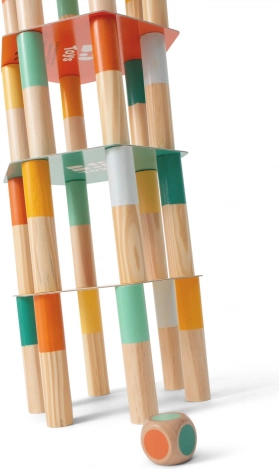 Byg et højt tårn af farvede søjler og platforme, og forsøg derefter skiftevis at fjerne den rigtige brik efter terningens farve. Hvert træk er spændende – et uheldigt valgt element kan få hele tårnet og halvkuglen på toppen til at falde. Spillet er lavet af kvalitets træ og karton, er sikkert, holdbart og fantastisk for både børn og voksne.