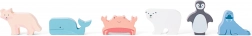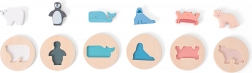Dette kvalitets træpuslespil kombinerer sjov og læring. Dyrene – sæl, isbjørn, krabbe, pingvin, ræv og spækhugger – indsættes i runde jetoner med omridsudskæring og samme farve, hvilket gør orienteringen lettere og styrker genkendelse af farver og former.