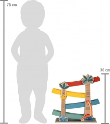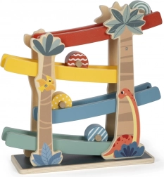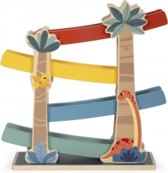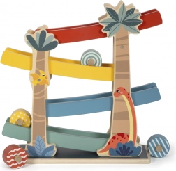 Denne træbane med dinosaurtema er et ideelt interaktivt legetøj for børn. Sammen med de farverige mønstrede skiver, der ruller ned ad ramperne, tilbyder det en sjov måde at lære om bevægelse og tyngdekraft. Produktfunktioner: