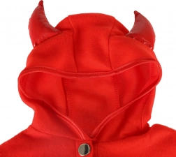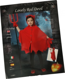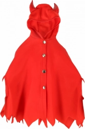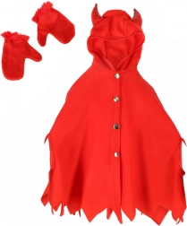 Forvandl dit barn på et øjeblik til en fræk lille djævel. Den røde kappe med hætte og markante horn har en savtakket underkant og lukkes med fire trykknapper, så den sidder godt og er nem at tage af og på. De bløde røde handsker med plys-kant varmer behageligt og fuldender djævle-looket.