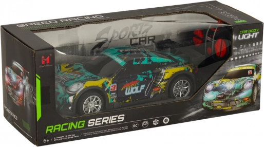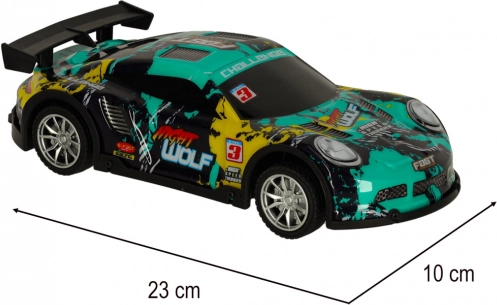 Sporty karrosseri, iøjnefaldende grafik og mål på 23 × 10 × 6,5 cm gør bilen til den ideelle makker til kørsel inde og ude. Stabilt chassis og spoiler understøtter frisk og jævn kørsel.
