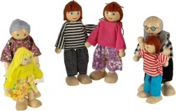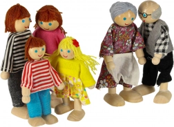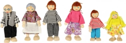 Komplet familie med 6 stk.: bedsteforældre, forældre og børn. Forskellige højder (ca. 11,5 cm og 9 cm) understøtter læring om roller og familierelationer.
