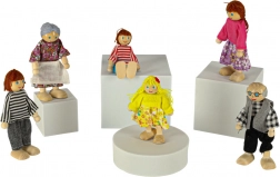 Dette træfamiliesæt er et ideelt tilbehør til ethvert dukkehus. Figurerne varierer i størrelse (voksne/bedsteforældre ca. 11,5 cm, børn ca. 9 cm) for troværdigt at afspejle forskellige generationer, og takket være tekstilbeklædningen virker de naturlige og legende.