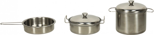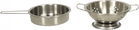 Køkkengrej i metal som i et rigtigt køkken