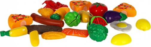 Frugt og grønt er delt i sektioner med velcro/magnet, så børn kan skære dem sikkert med en plastikkniv og servere på tallerkener.