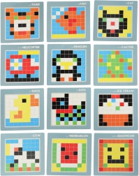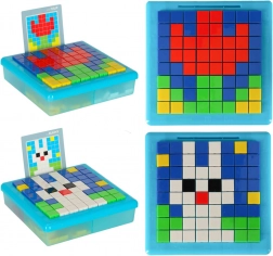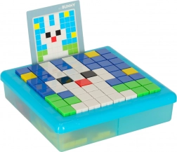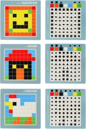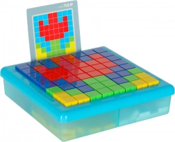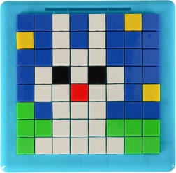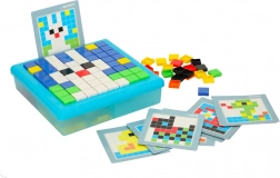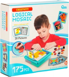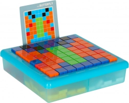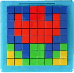 Denne kreative mosaik er et fremragende pædagogisk legetøj til børn fra 3 år. De farvede firkantede brikker placeres i et gitter på en stabil plade, så børnene træner logisk tænkning, rumlig forestillingsevne og koncentration. Med de medfølgende kort med skabeloner kan man vælge mellem enklere og mere udfordrende motiver.