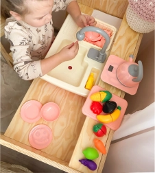 Børn leger let kokke og hjælpere i hjemmet: de serverer, skærer, vasker og rydder op. Dermed tilegner de sig nænsomt grundlæggende hygiejne og en økologisk tilgang til vand, mens forældre vil værdsætte et mere ryddeligt legehjørne.