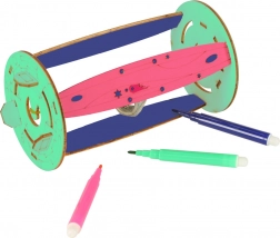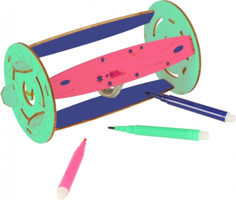 Med de medfølgende tilbehør kan børn afprøve forskellige fænomener: elasticitet og potentiel energi (elastikmodellen), balance og spænding i snore (den hængende “UFO”-model) samt virkningerne af tyngdekraft og bevægelse (katapult med metalkugle). Tuscher i 9 farver gør det muligt at dekorerer og personalisere hver kreation.