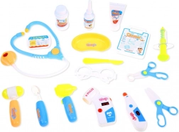 Stetoskop, termometer, otoskop, blodtryksmåler, sprøjte, saks, skalpel, briller og mere – alt til en komplet lægerolleleg.