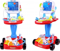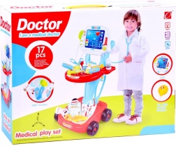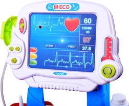 Dette komplette sæt til små læger byder på realistiske elementer som et panel med “EEG/monitor” med lys og lyde, et stetoskop med hjertelyd samt termometer og blodtryksmåler med bagbelyst resultat. Takket være den robuste vogn på hjul kan udstyret nemt flyttes rundt i rummet.