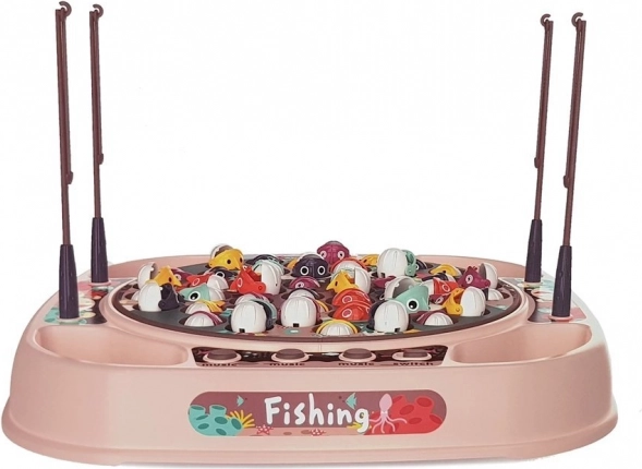 Pink fiskefangst-spil med musik: 4 fiskestænger, 45 fisk og 3 melodier. Til børn fra 3 år, strøm 3× AA. Sjov for hele familien.