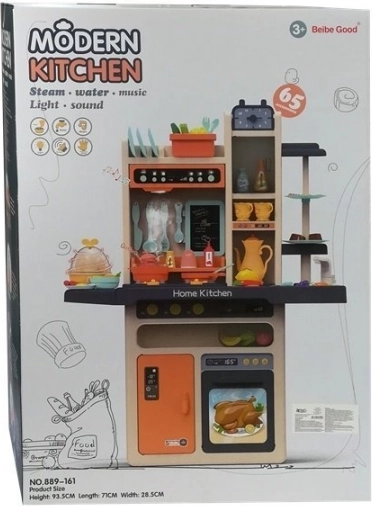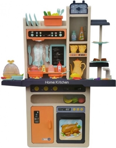 Dette moderne børnekøkken imponerer med en rolig kombination af orange og creme samt et design, der minder om et rigtigt hjemmekøkken. Takket være lys på kogepladen og realistiske madlavningslyde kan børn fordybe sig i rollen som små chefkokke. Praktiske hylder, kroge og rum hjælper med at holde orden og udvikle organisatoriske vaner.