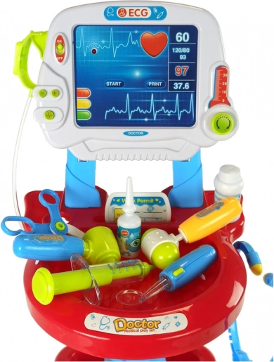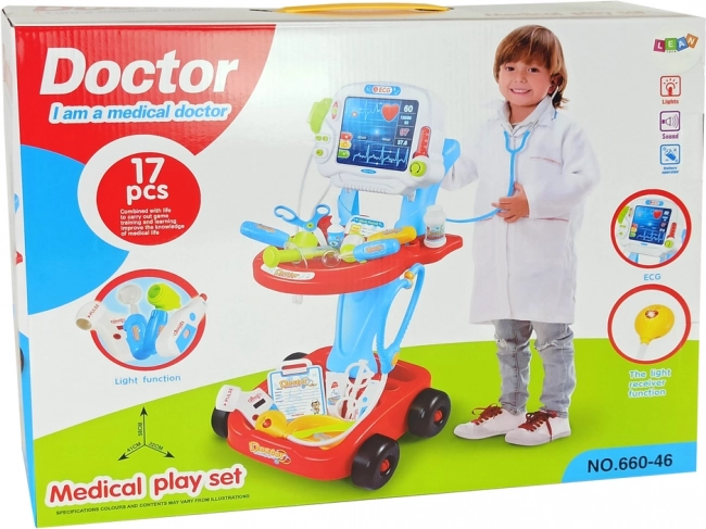 Børnelægesæt på vogn med EKG, 17 dele. Lys- og lydeffekter, rigt tilbehør, mål 31×30×62 cm. Til børn fra 3 år, EN71, CE.