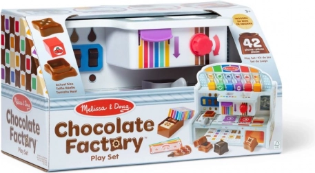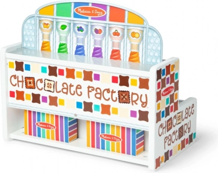 Sættet indeholder farverige træ-“chokolader”, værktøj og tilbehør, så børn kan begynde at skabe og sælge lige efter udpakning.