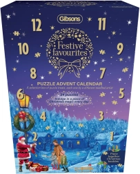 Med Gibsons julekalender får du en særlig overraskelse hver dag indtil jul. Indeholder 24 konturpuzzlebilleder, som du kan samle og bruge som hængende julepynt takket være den medfølgende lim og bånd.