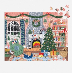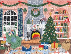 Den hyggelige scene med juletræ, pejs og gaver lyser hjemmet op og bringer dig i julestemning. Det færdige puslespil måler ca. 58,4 × 44,5 cm – ideelt til at stille frem.