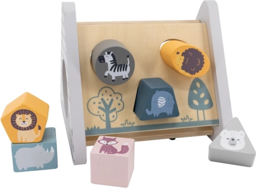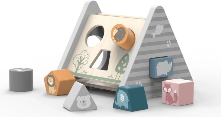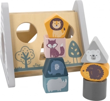 Opdag en legende læringslegetøj til de mindste: en træformsorter i pyramideform med blide pastelfarver og dyreillustrationer. Børn øver sig i formgenkendelse, finmotorik og hånd-øje-koordination, mens de sikre trådele med ugiftige farver giver glæde og tryghed for forældrene.
