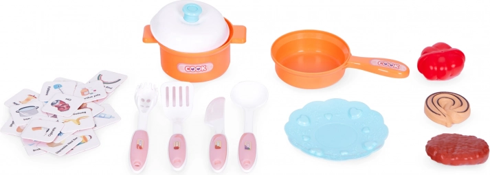- 10 tilbehør: gryde med låg, pande, redskaber, madvarer og dekorationer.