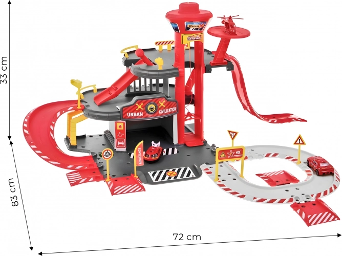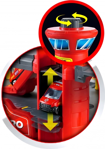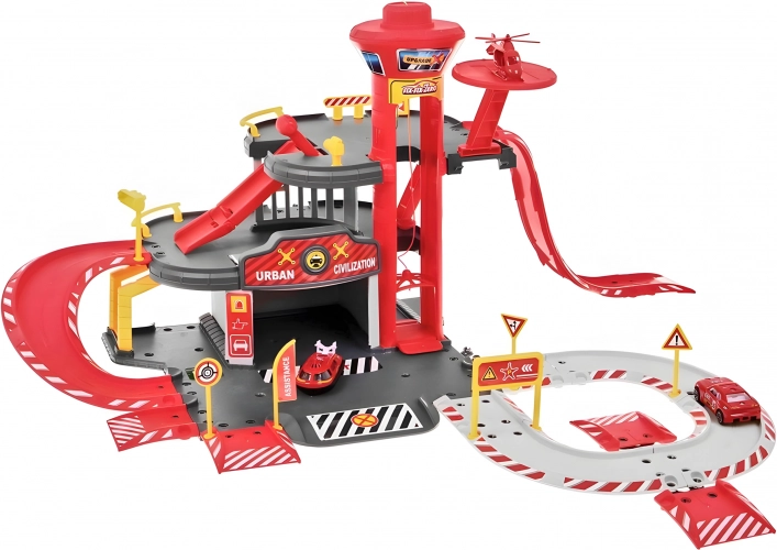 Brandstation garage, 3 niveauer med elevator, biler + helikopter, 74 dele