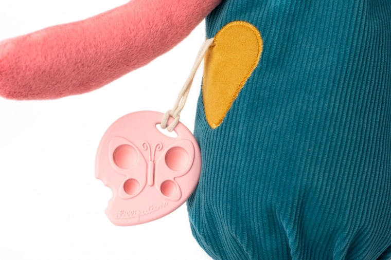 Hjerte- og sommerfugledetaljer, farverigt tørklæde og legesyede sting vækker barnets nysgerrighed og giver nye impulser ved hver berøring.