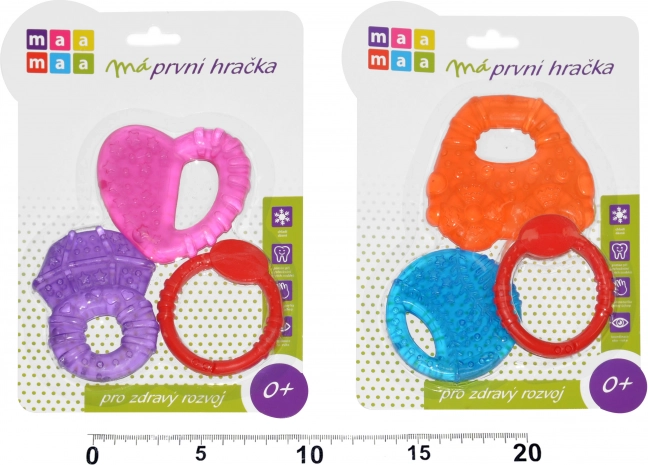 Sættet med kølende bideringe er designet til at lindre børn under frembrud af de første tænder. Efter afkøling i køleskabet (ca. 1 time) hjælper kulden med at reducere blodfyldning i gummerne og forebygge irritation, mens den varierede overfladetekstur masserer gummerne og understøtter naturlig bidetræning. Takket være den lette konstruktion og det behagelige materiale er bideringene nemme at holde selv for de mindste hænder.