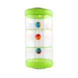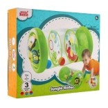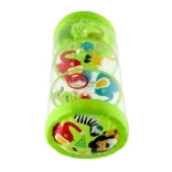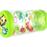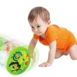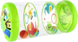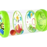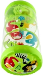 Cylinderen er udsmykket med farverige dyreillustrationer og indeholder tre bolde, der rasler let ved bevægelse, hvilket underholder og stimulerer børnene.