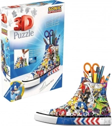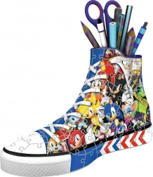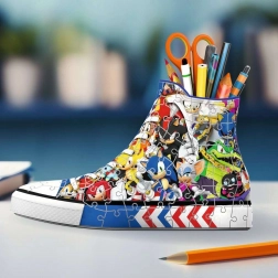 Opdag Ravensburger 3D puslespil i form af en sneaker med Pindsvin Sonic-motiv, som kan tjene som en original holder til penne, farveblyanter eller pensler. Samlingen er muliggjort ved specielle buede og fleksible brikker, der passer præcist på deres plads, og derved skaber en solid og stabil konstruktion uden behov for lim.