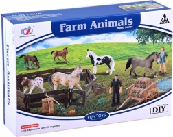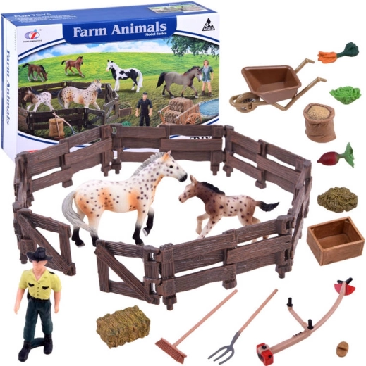 Dette veludstyrede sæt tager børn med ind i gårdens verden. Det indeholder to naturtro hestefigurer (hoppe og føl), en bonde, en indhegning og masser af tilbehør som trillebør, greb, rive, krybbe og foder. Realistiske detaljer, fra "træ"-strukturen på hegnet til hestenes farver, stimulerer fantasien og giver timevis af leg.