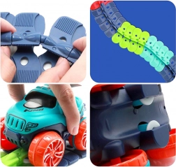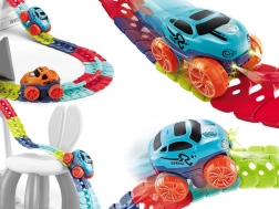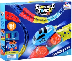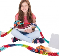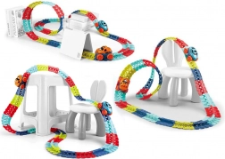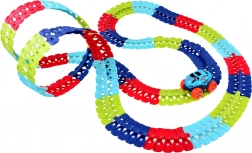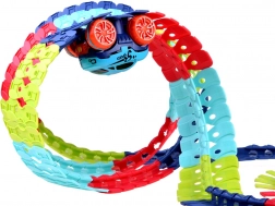 Denne farverige racerbane af robust plast består af 184 forbundne segmenter, som frit kan bøjes og ombygges. Skab en dynamisk rute fuld af sving, loops og højdeforskelle – styreskinnen midt på banen hjælper bilen med at holde sig sikkert på sporet. Efter isætning af 3× AAA (medfølger ikke) suser bilen af sted med et enkelt tryk på knappen og lyser med rødt og grønt lys under kørslen.