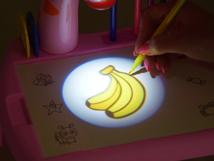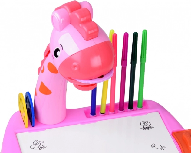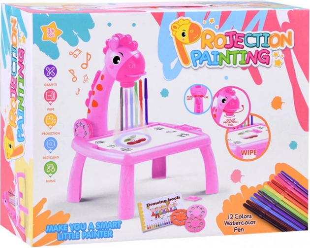 Det projicerende male- og tegnebord Giraf er ideelt til små kunstnere. Projektoren projicerer billeder på tegnefladen, som barnet nemt kan tegne efter og farvelægge. Takket være de kompakte mål kan pladen bruges på et bord eller stilles på de medfølgende ben som små tegneborde til børn.