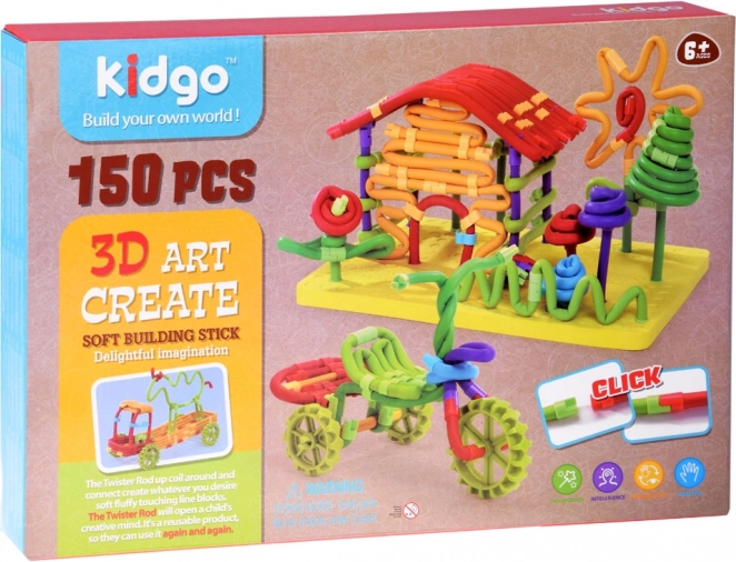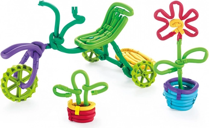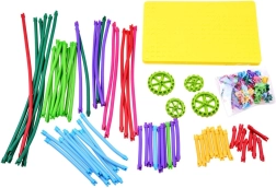Dette farverige sæt kombinerer bløde skum “makaroni”, plastikhjul, forbindere og en basisplade. Børn kan bøje, flette og forbinde pindene til 3D-konstruktioner, figurer eller små køretøjer. Ideelt til børn fra ca. 3 år – byggesættet støtter koncentration og glæden ved at opdage.