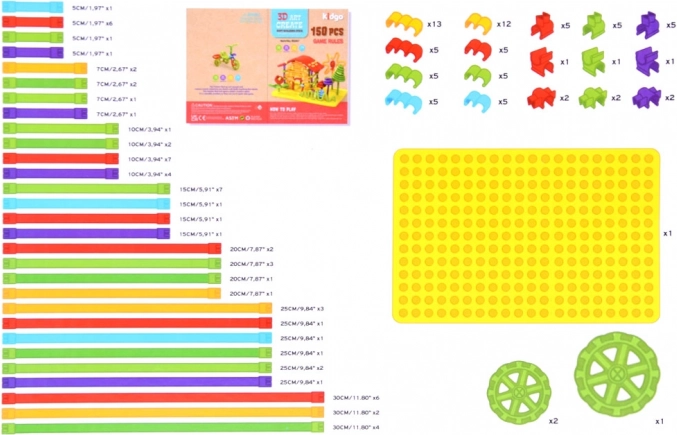 Medfølger en gul basisplade, forbindere og hjul til stabile og funktionelle modeller. Sættet suppleres af en overskuelig billedvejledning for en nem start.