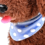 Brun krøllet pels, blå tørklæde med prikker og blød plys, der indbyder til kram.