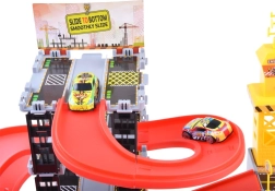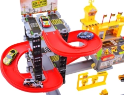 Den fleretagers garage med røde, rutsjebanelignende ramper giver jævn nedkørsel for bilerne og dynamisk leg. Parkeringspladser og indkørsler understøtter realistisk trafik.