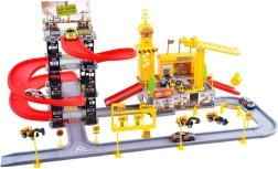 Byg din egen by! Et parkeringshus i fire niveauer med nedkørsler, parkeringspladser, tankstation og vejskilte forbindes via en bred vej til byggezonen. Børn kan parkere personbilerne og tage afsted med byggeholdet til pladsen, hvor en kran, gravemaskine, bulldozer og en tryklufthammer venter.