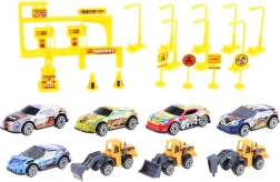 Indeholder 5 personbiler, 3 byggemaskiner og vejskilte. Børn kan samle en komplet verden med parkeringshus, tankstation og vejelementer.