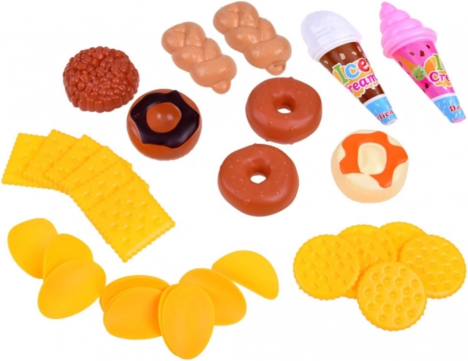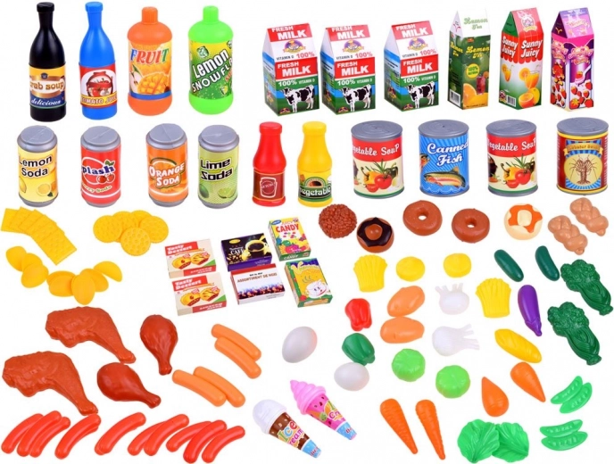 Dette store sæt lege-mad giver børn timevis af sjov i hjemme-køkkenet og butikken. Takket være det brede udvalg – fra frugt og grøntsager til bagværk samt drikkevarer og søde sager – kan små kokke sammensætte “menuer” efter fantasien og lære grundlæggende om sund kost, indkøb og organisering.