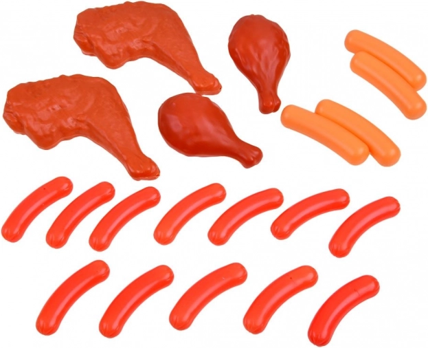 Detaljerede dele som kyllingelår, pølser, is, småkager og juicekartoner stimulerer kreativiteten og efterligning af voksne i køkkenet og butikken.