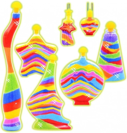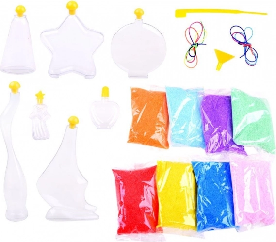 Komplet pakke med flasker, vedhæng, 8 farver sand og tilbehør gør det muligt at begynde at skabe med det samme efter udpakning.